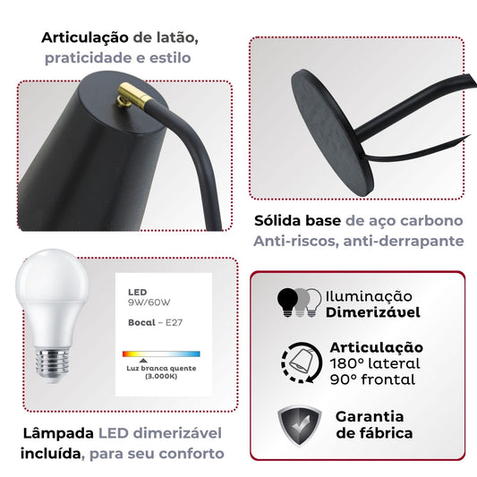 Luminária de Mesa TUTTO S, Articulação total, Dimerizável, LED Luz Quente Inclusa, Base sólida