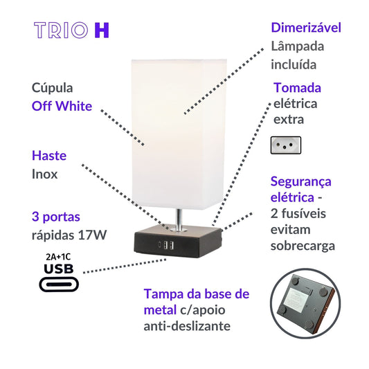 Abajur TRIO USB | 3 portas rápidas | 2A + 1 tipo C | Tomada incluída