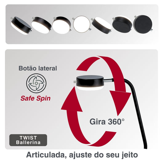Luminária TWIST Ballerina, Articulação 360°SAFE SPIN, LED 9W Luz Neutra, Base Sólida, Design