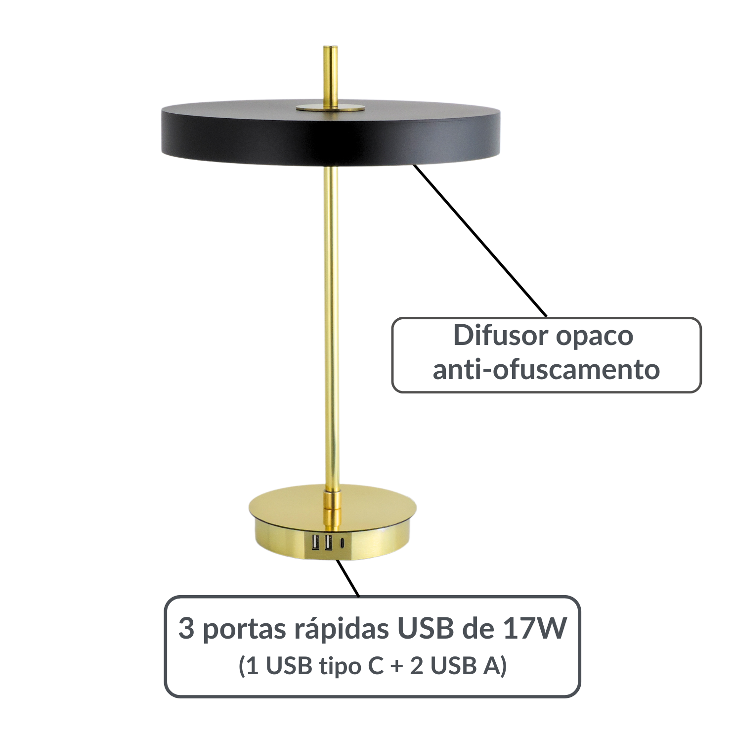 A BRIT, nosso último lançamento, com design moderno e elegante a cúpula da BRIT parece flutuar suspensa pela haste dourada, agrega ainda a praticidade de carga rápida 17W de três dispositivos eletrônicos simultaneamente.Ideal no escritório, sala de TV e sala de estar.