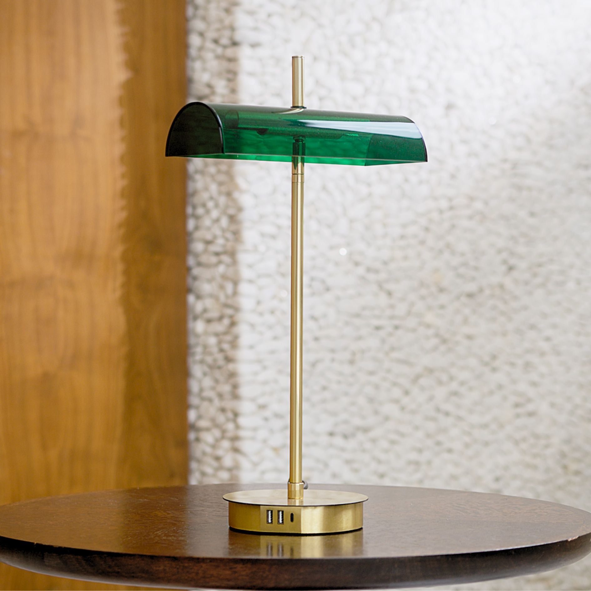 A luminária Banker da Ocanova é uma releitura moderna da clássica Banker, patenteada em 1909. Com a característica cúpula verde esmeralda e um acabamento em latão acetinado, incluímos um módulo de 3 portas USB para carga rápida de todos os seus dispositivos eletrônicos.
